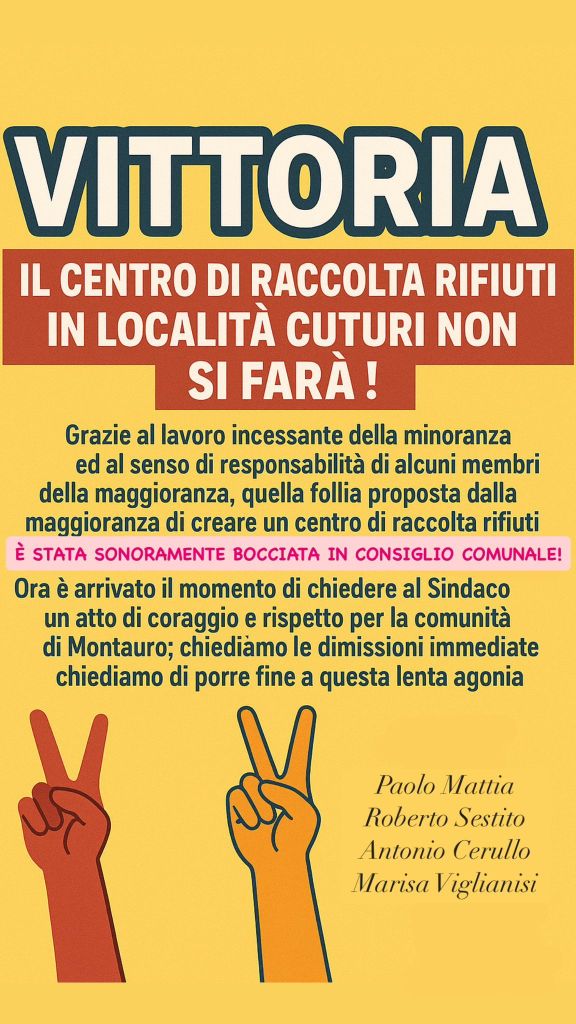 “Nella seduta di ieri del Consiglio Comunale di Montauro- scrivono i consiglieri-grazie all’impegno della minoranza, è stata bocciata la proposta di costruire un centro di raccolta rifiuti presso la località Cuturi. Questa decisione rappresenta un importante passo avanti nella tutela della salute e del benessere dei cittadini che abitano nelle aree limitrofe e che, dall’oggi al domani, senza essere neanche minimante informati, avevano potuto apprendere grazie all’attività di informazione svolta dalla minoranza, che la giunta comunale (nelle persone del Sindaco Cerullo e del Vicesindaco Carito) aveva votato favorevolmente alla realizzazione di quell’opera.
